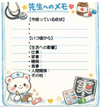 「どんな症状が、いつから続き、生活にどう影響しているか」が分かると、医師も状況を確認しやすくなります。